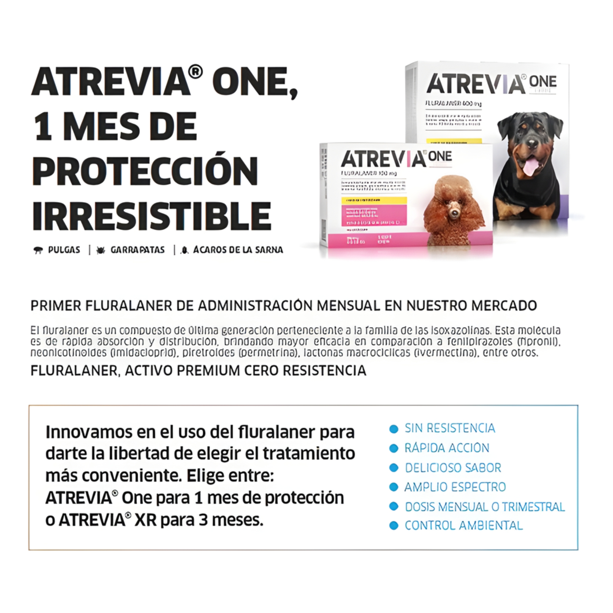Atrevia One es un antiparasitario oral de administración mensual para perros, formulado con Fluralaner, una isoxazolina que actúa de forma sistémica contra pulgas y garrapatas.
