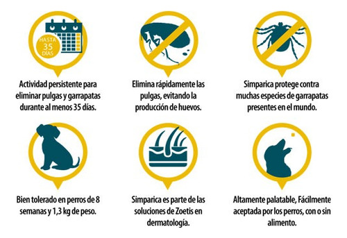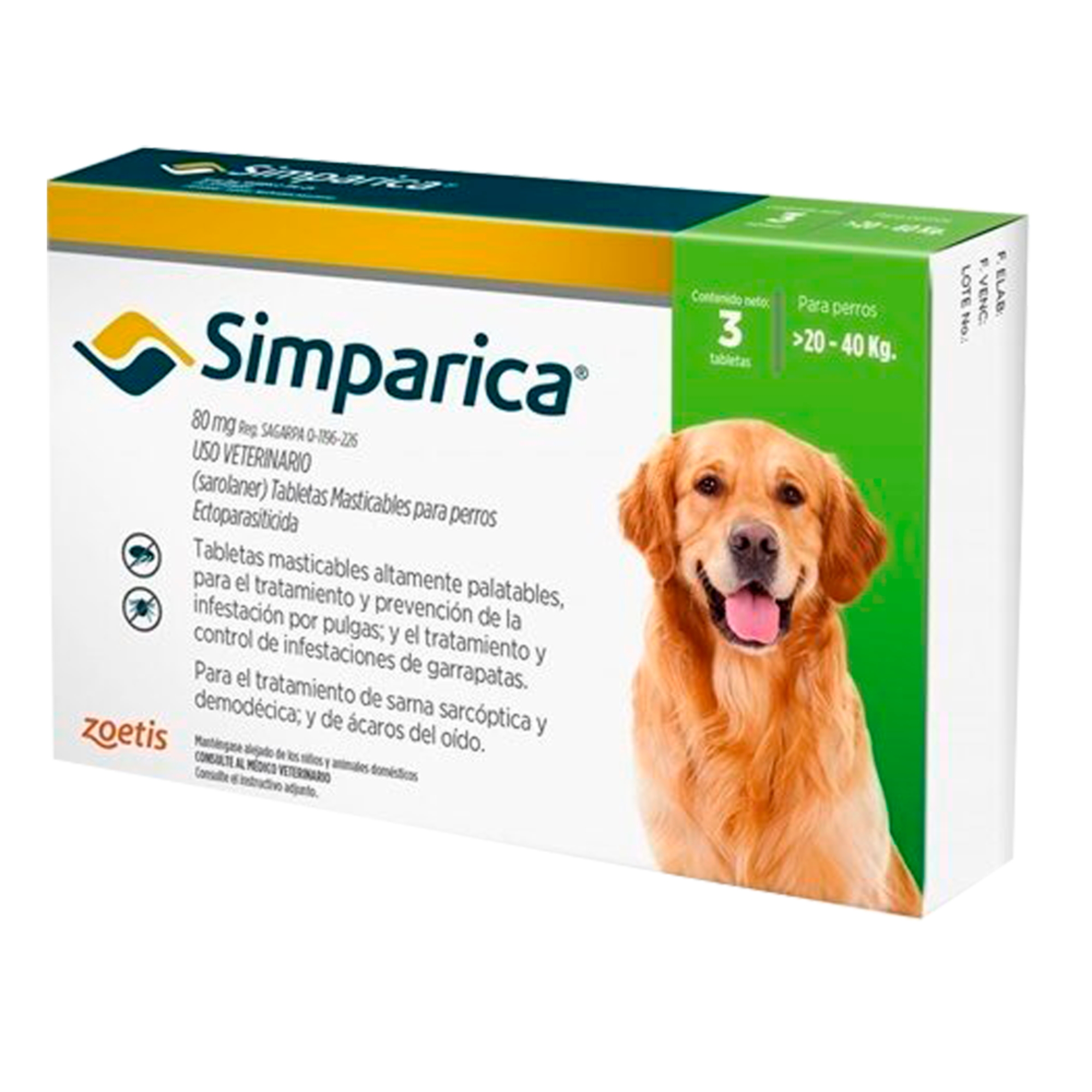 Simparica® es una tableta masticable diseñada para brindar protección efectiva y duradera contra pulgas y garrapatas en perros. Formulada con Sarolaner, una molécula purificada, Simparica® actúa rápidamente para controlar infestaciones, eliminando pulgas dentro de las primeras 8 horas y garrapatas dentro de las primeras 12 horas. Su efecto se mantiene durante 35 días sin perder eficacia, convirtiéndola en una solución ideal para el control de parásitos.